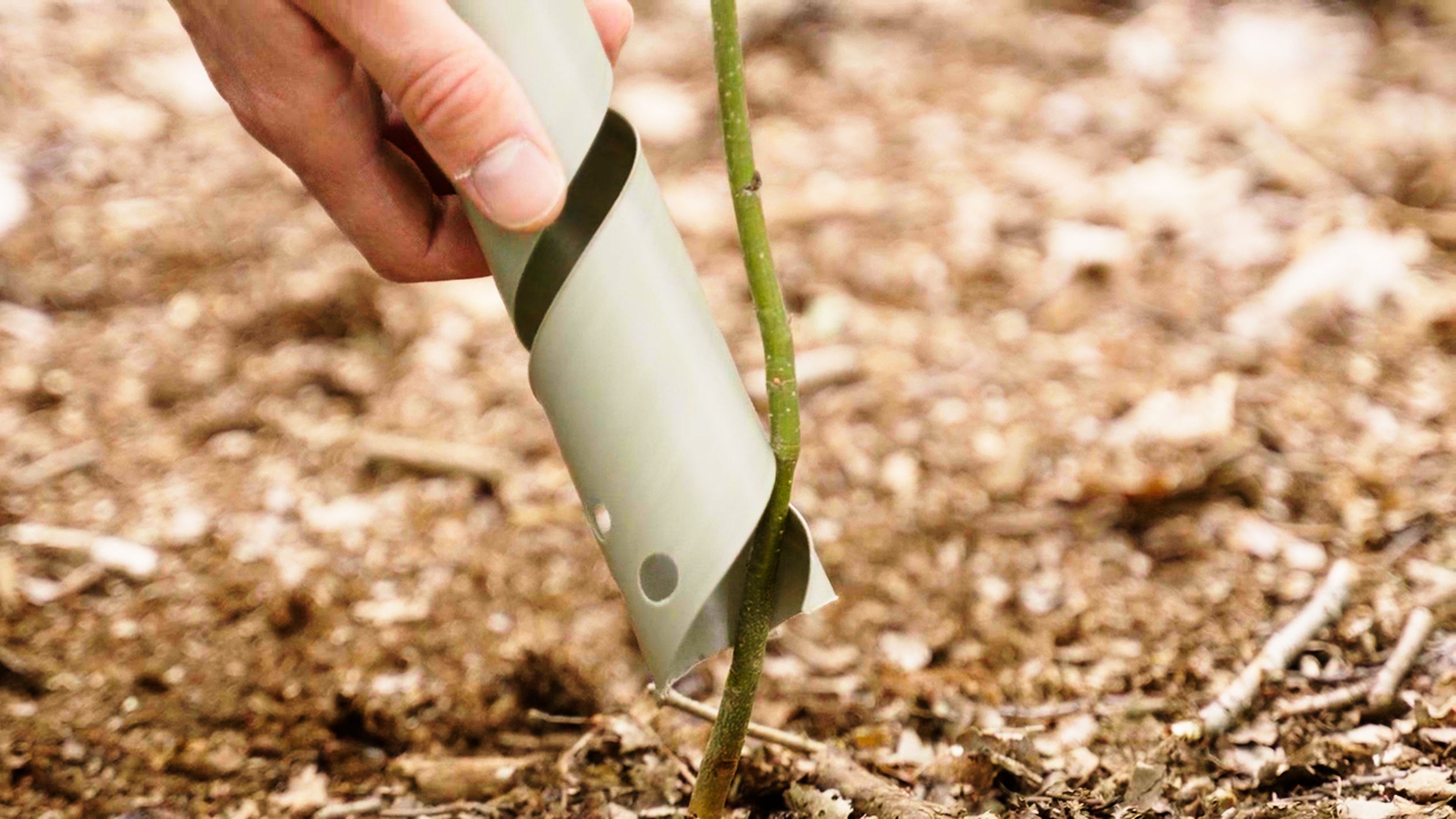 Zet de gesloten koker voorzichtig rond de stam van de jonge boom of struik. Zorg dat de koker de stam niet raakt, maar deze wel volledig omsluit.